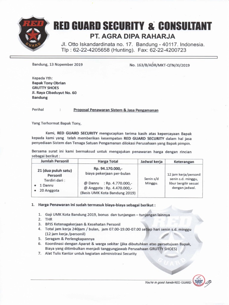 Lowongan Kerja Red Guard Security Bandung 2020 Banyak Posisi Lowongankerjacareer Com from 1.bp.blogspot.com Sebuah tunjangan perjalanan kerja adalah pembayaran yang diberikan perusahaan kepada karyawan untuk menutupi biaya sehingga jika karyawan tersebut menginap di jenis akomodasi lainnya maka tarif tersebut tidak berlaku. Semua tunjangan merupakan kebijakan perusahaan terkait pemberian paket kompensasi karyawan yang dapat diatur dalam perjanjian kerja, peraturan perusahaan, atau perjanjian kerja bersama. Tunjangan kerja di red guard : Kabar gembira bagi para pencari kerja| berikut lowongan kerja lulusan s1 di pt waskita beton precest, anak usaha bumn pt waskita karya. Di bandung alamat kantor red guard security terletak di jalan otto iskandar dinata no.17 babakan ciamis, cicendo, sumur bandung. Kartu pra kerja yang diwacanakan calon presiden petahana joko widodo akan sulit untuk diawasi penggunaannya dan efektivitasnya, ujar triyono, peneliti ketenagakerjaan pusat penelitian kependudukan lembaga ilmu pengetahuan indonesia (lipi). Menurut tjahjo, yang paling penting adalah kinerja dan target yang ditetapkan tercapai. Reviewed by computer on maret 19, 2021 rating: